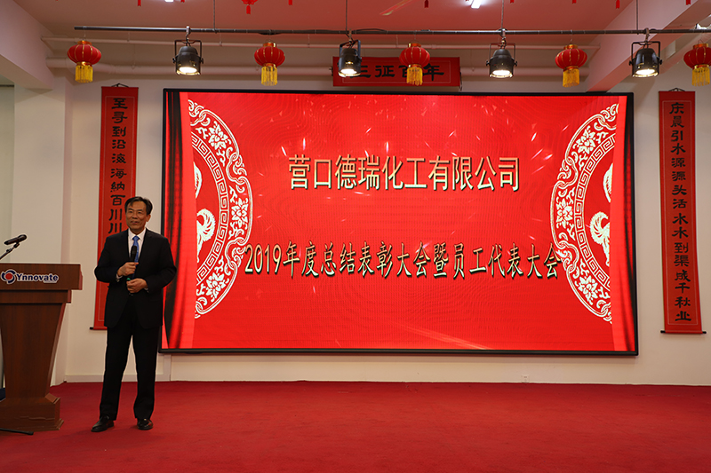 2020年1月22日上午9:00,營口德瑞化工有限公司2019年度總結(jié)表彰大會暨員工代表大會在員工食堂隆重召開,“三征”創(chuàng)始人劉慶晨教授,盛海投資董事長、營創(chuàng)三征黨委書記劉至尋先生,營新科技生產(chǎn)總監(jiān)劉健先生,營創(chuàng)三征行政總監(jiān)商富麗女士,營創(chuàng)三征ESH總監(jiān)齊長亮先生,德瑞化工全體管理層及員工代表,共計150余人出席了大會,公司副總經(jīng)理周永強先生主持會議。